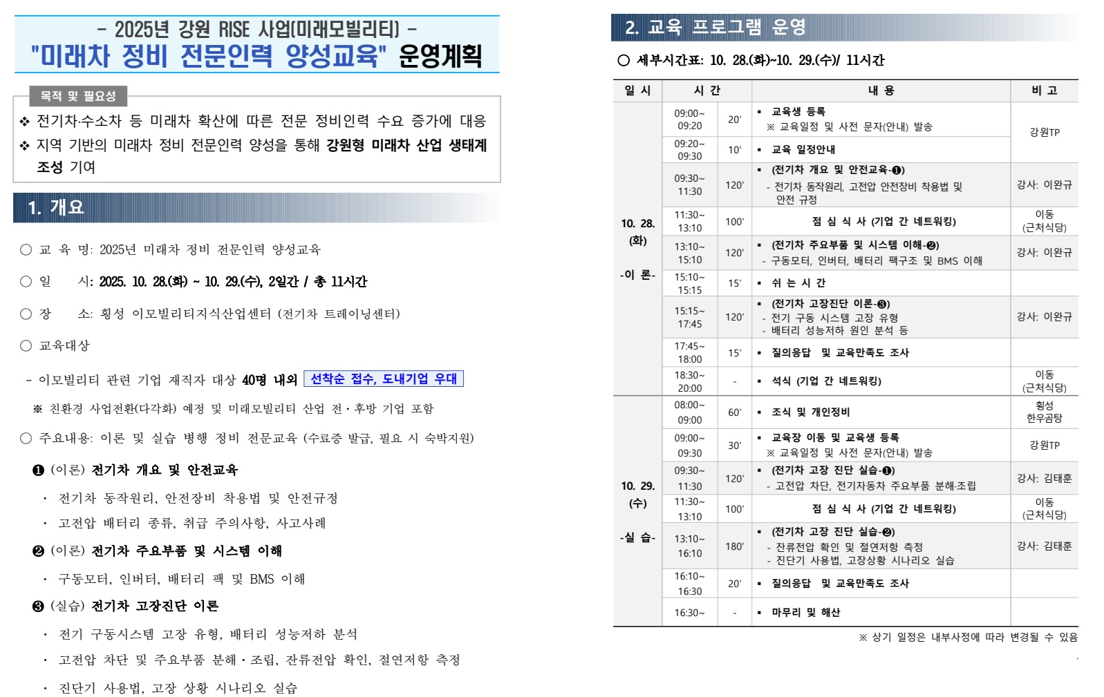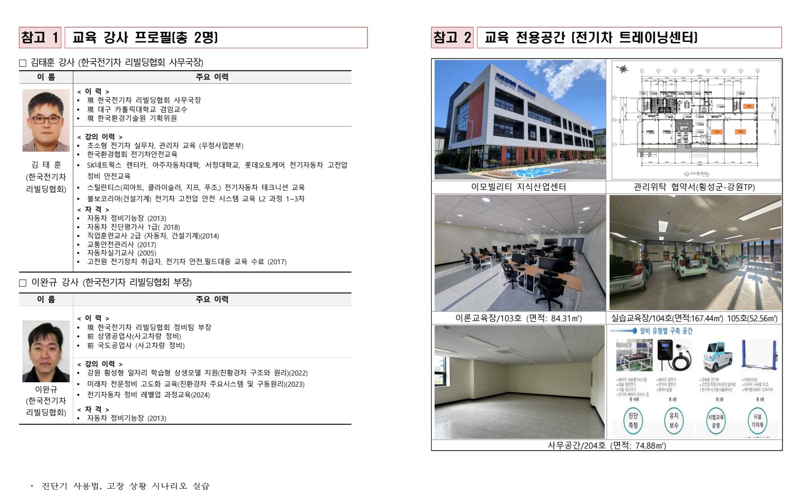 | 교육장소 | 횡성 이모빌리티지식산업센터 (전기차 트레이닝센터) * 강원특별자치도 횡성군 상하가리 442-1 | ||